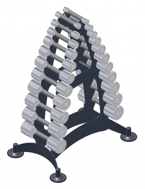 Изготавливается из металла толщиной 6 мм. Стойка окрашивается порошковой краской и оснащена амортизирующими подпятниками, не требующими крепления к полу. Гантели фиксированного веса с хромированным покрытием состоят из двух монолитных цилиндрических гранат и грифа.